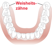 Weisheitszähne sind die letzten Zähne in der oberen und unteren Zahnreihe und füllen somit die Funktion der dritten Backenzähne aus. Sie entwickeln sich viel später als die anderen Zähne. Bei Jugendlichen sind sie erst ab dem Alter von 14 Jahren auf dem Röntgenbild des Kiefers zu sehen und brechen meist zwischen dem 17. und 25. Lebensjahr durch. Bei manchen Patienten treten die Weisheitszähne gar nicht hervor, sondern bleiben im Kiefer. Diese bezeichnet man als retinierte Weisheitszähne. Ebenso gibt es Menschen, bei denen die Weisheitszähne gar nicht oder mehrfach angelegt sind. In vielen Fällen müssen die Weisheitszähne entfernt werden, da sie die übrigen Zähne im Kiefer verschieben oder schädigen würden. |